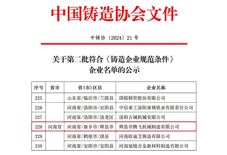 9月11日,中國鑄造協(xié)會官網(wǎng)公示了“第二批符合《鑄造企業(yè)規(guī)范條件》企業(yè)名單”,輝縣市騰飛機(jī)械制造有限公司榮登榜單。